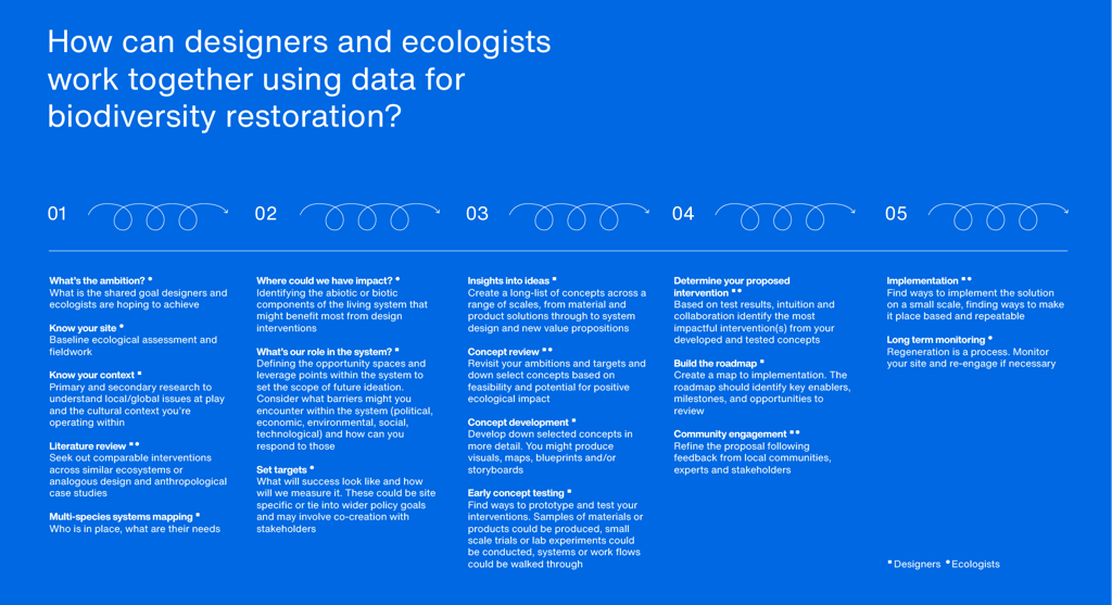 When thinking about commonalities between design and ecology work, I was drawn to the ways I’ve seen Life Cycle Assessment (LCA) data built into sustainable product design processes. Using that thinking as a structure, I have proposed a framework that swaps product system baselines for ecological assessment baselines. The proposed framework contains loosely defined steps and roles, remaining broad enough that it could be applied to a range of contexts and adapted to the needs of species, people and place.